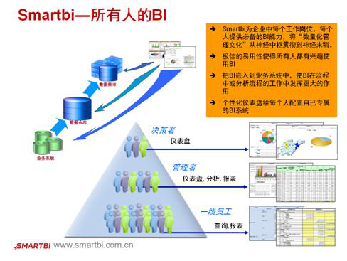 數(shù)據(jù)應用即為數(shù)據(jù)的應用、交換與服務,需要通過思邁特軟件Smartbi等可視化的途徑直接服務于企業(yè)的一線生產(chǎn)人員、監(jiān)管人員、業(yè)務負責人、公司高層以及企業(yè)董事。