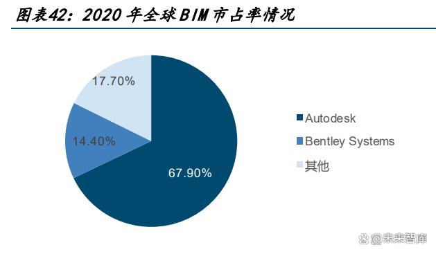 信創(chuàng)發(fā)展背景下,BIM 行業(yè)國產化替代需求強烈。信息技術應用創(chuàng)新為近年以來我國關鍵 命題,旨在通過對 IT 硬件、軟件的重構,建立我國自主可控的 IT 產業(yè)標準和生態(tài),逐步 實現(xiàn)各環(huán)節(jié)國產替代。國內使用的 BIM 平臺主要為國外軟件,而國內廠商主要以項目管理 和單點應用類型的產品為主,底層核心技術大多掌握在國外廠商手中。2020 年全球 BIM 行業(yè)市場中,Autodesk 市占率為 67.9%,其次 Bentley Systems 市占率為 14.37%,CR2 集中度較高,顯示出國產替代的必要性和緊迫性。