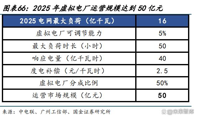預計 2025 年虛擬電廠投資規(guī)模達到 800 億元,運營市場規(guī)模達到 50 億元。現(xiàn)階段主要 的盈利模式為通過需求側響應賺取輔助服務費用后的分成。據(jù)中電聯(lián)預計,2025 年我國 全社會用電量將達 9.5 萬億千瓦時,而最大負荷將達到 16 億千瓦,按 5%可調節(jié)能力、投 資成本 1000 元/千瓦計算,預計到 2025 年,虛擬電廠投資規(guī)模有望達 800 億元。參考目 前峰值負荷時長水平,我們預計 2025 峰值負荷將達到 50 小時,對應 2025 年電網(wǎng)需求側 響應電量 40 億千瓦時。目前我國虛擬電廠處于發(fā)展初期,度電補償較高以刺激時長,參 考《廣州市虛擬電廠實施細則》0-5 元/千瓦時的削峰響應補貼,預計 2025 年虛擬電廠進 入商業(yè)化運營后,補償標準為 2.5 元/千瓦時。假設分成比例為 50%,則預計 2025 年虛擬 電廠運營市場規(guī)模將達到 50 億元。