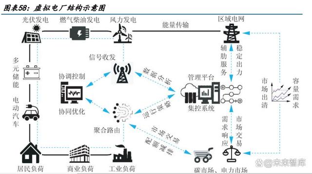 虛擬電廠本質上是一套軟件平臺系統(tǒng),核心為“通信”和“聚合”。通過先進信息通信技 術和軟件系統(tǒng),實現(xiàn)分布式電源、儲能系統(tǒng)、可控負荷、電動汽車等分布式能源資源的聚 合和協(xié)調優(yōu)化,以作為一個特殊電廠參與電力市場和電網(wǎng)運行的電源協(xié)調管理系統(tǒng),為配 電網(wǎng)和輸電網(wǎng)提供管理和輔助服務。虛擬電廠概念的核心可以總結為“通信”和“聚合”, 關鍵技術主要包括協(xié)調控制技術、智能計量技術以及信息通信技術。 虛擬電廠分為兩類:“負荷類”虛擬電廠,和“源網(wǎng)荷儲一體化”虛擬電廠。1)“負荷類” : 聚合了具備調節(jié)能力的電動汽車、充電樁等市場化用戶,作為一個整體,對外提供負荷側 靈活性相應調節(jié)服務。2)“源網(wǎng)荷儲一體化”:聚合新能源發(fā)電、用戶及配儲一系列環(huán)節(jié), 作為獨立市場主體參與電力市場、具備自主調峰調節(jié)能力。 具備“源-荷”雙重身份,有效實現(xiàn)削峰填谷。虛擬電廠把各類可調負荷資源匯聚,根據(jù) 電網(wǎng)削峰填谷的需求,進行線上填報,計劃下發(fā),執(zhí)行反饋,類似于線上工單派單系統(tǒng)。 電網(wǎng)給調度指令計劃,需求響應調控計劃,提前幾天/幾周把計劃發(fā)下來。負荷集成商, 虛擬電廠運營商,會把計劃告訴客戶,哪些時段把負荷停掉,把用電負荷降下來,具有源 -荷雙重身份。