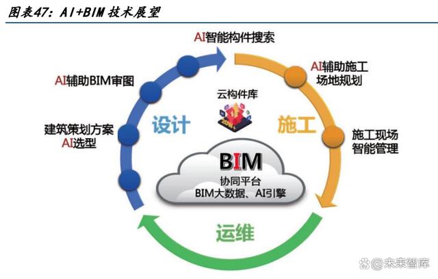 BIM 與人工智能深度融合,有望在設計、施工、運維階段開拓應用場景與解決方案。 設計階段:1)構件智能搜索:可以在構件智能搜索中使用人工智能對構件進行準確 的自動分類,以及使用自然語言理解技術實現(xiàn)構件屬性的智能校準;2)AI 輔助布局 規(guī)劃:融入最新的機器學習技術,可以在瀏覽器上生成建筑策劃文件,并輸出建筑空 間的最優(yōu)化布局;3)AI 輔助 BIM 審圖:AI 技術可以輔助 BIM 對大量規(guī)范、圖集、標 準以及模型、圖紙的匹配性學習,做好設計合規(guī)性、合理性的把控。施工階段:進行輔助施工場地規(guī)劃,AI 可以通過場地智能布置和合規(guī)合理性校驗來 幫助經(jīng)驗不足的技術人員增質提效,通過建模對施工現(xiàn)場不同階段的復雜狀態(tài)進行模 擬展示,通過數(shù)據(jù)分析及時反饋前期方案的合理性,同時反向指導施工組織設計,進 行資源配置優(yōu)化。 運維階段:進行運維智能管理,AI 可以通過機器人和無人機等的應用,使用大量實 際現(xiàn)場視頻數(shù)據(jù)進行訓練,對現(xiàn)場數(shù)據(jù)進行分類處理和智能管理,大幅提升施工效率 和安全質量水準。