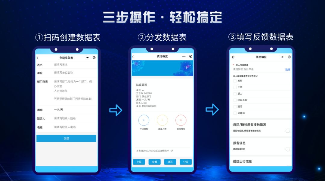 只需微信掃描二維碼進(jìn)入界面,簡(jiǎn)單進(jìn)行三步操作即可搞定每日繁瑣的數(shù)據(jù)收集工作,并在系統(tǒng)后臺(tái)進(jìn)行統(tǒng)計(jì)和數(shù)據(jù)匯總。使用說(shuō)明書(shū)?不存在的!一秒上手,簡(jiǎn)直So easy!
