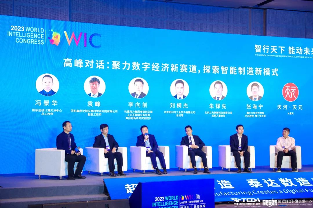 高峰對話環(huán)節(jié)由國家超級計算天津中心總工程師馮景華主持,圍繞“聚力數(shù)字經(jīng)濟(jì)新賽道,探索智能制造新模式”主題展開探討。國機(jī)集團(tuán)沈陽儀表科學(xué)研究院有限公司副總工程師袁峰;軟通動力集團(tuán)高級副總裁,工業(yè)互聯(lián)網(wǎng)業(yè)務(wù)總裁,集團(tuán)創(chuàng)新研究院副院長、李向前;北京和利時工業(yè)軟件有限公司總經(jīng)理、劉桐杰;北京蘭光創(chuàng)新科技有限公司創(chuàng)始人、董事長,朱鐸先;南開大學(xué)軟件學(xué)院、杰出教授、博士生導(dǎo)師、張海寧;以及神秘的 AI 嘉賓-天河·天元,現(xiàn)場共話智能制造新模式,推動數(shù)字經(jīng)濟(jì)發(fā)展。