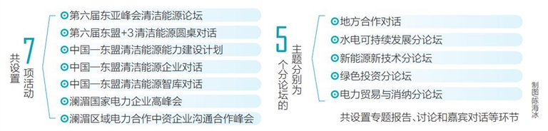 本次中國—東盟清潔能源合作周以“跨越山海 共享未來”為主題,活動(dòng)期間將舉辦第六屆東亞峰會(huì)清潔能源論壇、第六屆東盟+3清潔能源圓桌對(duì)話、中國—東盟清潔能源能力建設(shè)計(jì)劃、中國—東盟清潔能源企業(yè)對(duì)話、中國—東盟清潔能源智庫對(duì)話、瀾湄國家電力企業(yè)高峰會(huì)、瀾湄區(qū)域電力合作中資企業(yè)溝通合作峰會(huì)等7項(xiàng)活動(dòng)。5場(chǎng)分論壇的主題分別為“地方合作對(duì)話”“水電可持續(xù)發(fā)展分論壇”“新能源新技術(shù)分論壇”“綠色投資分論壇”“電力貿(mào)易與消納分論壇”,設(shè)置了專題報(bào)告、討論和嘉賓對(duì)話等環(huán)節(jié)。