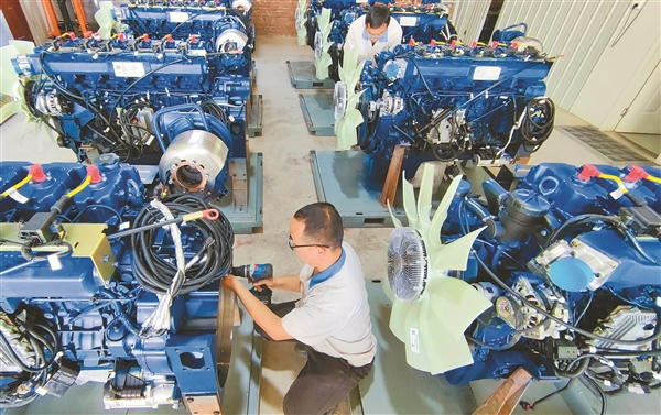 在山西榆新甲醇發(fā)動機有限公司生產(chǎn)車間,工作人員正在安裝發(fā)動機零部件。 謝晉攝