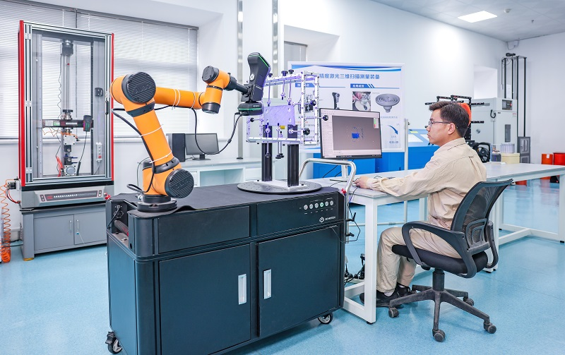 ▲國網(wǎng)江蘇電科院專業(yè)人員在電力物資質(zhì)量檢測實驗室,開發(fā)適用于絕緣子、金具等物資的高精度激光測量設(shè)備