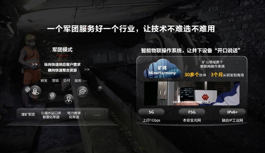 為了幫助企業(yè)選好技術(shù)、用好技術(shù),另一個(gè)關(guān)鍵措施就是成立軍團(tuán)。自去年底,我們已面向煤礦、港口、電力等多個(gè)行業(yè)成立了多個(gè)軍團(tuán)組織。軍團(tuán)是專業(yè)化隊(duì)伍,一方面,對(duì)內(nèi)拉通端到端的資源,包括研發(fā)、銷售、交付、服務(wù)等,以便深入理解行業(yè)的生產(chǎn)實(shí)踐和行業(yè)知識(shí),打造適配場(chǎng)景的產(chǎn)品和解決方案;另一方面,對(duì)外聯(lián)合更多的解決方案伙伴,把華為和伙伴的能力整合在一起,形成針對(duì)性的解決方案。