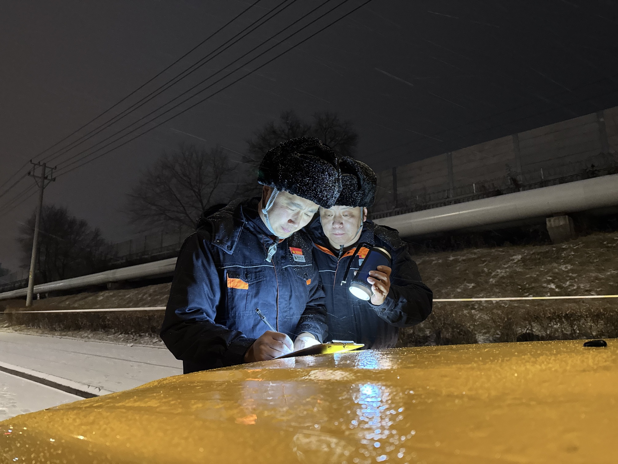11月25日,黑龍江鶴崗供電公司組織運維人員對10千伏煤建甲饋線進行雪天特巡,工作人員正在記錄缺陷(徐海峰 攝)