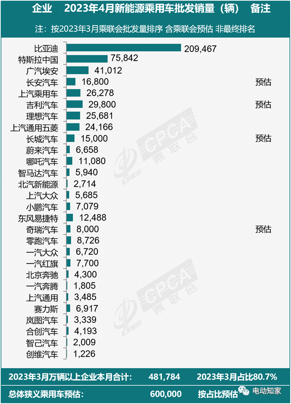 日前,乘聯(lián)會公布4月新能源乘用車廠商批發(fā)銷量排名,比亞迪以209467臺位列第一,特斯拉中國以75842臺位列第二,廣汽埃安以41012臺位列第三。