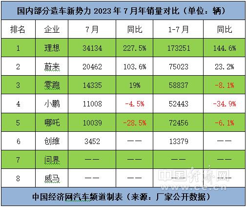 8月1日,幾家國內(nèi)造車新勢力的銷量數(shù)據(jù)如期而至。數(shù)據(jù)顯示,7月,理想、蔚來、零跑、小鵬和哪吒的銷量分別為34134輛、20462輛、14335輛、11008輛、10039輛,同比分別增長227.5%、103.6%%、19%、-4.5%、-28.5%;前7個月的累計(jì)銷量分別為173251輛、75023輛、58837輛、52443輛、72456輛,同比分別增長144.6%、23.2%、-8.1%、-34.9%、-6.1%。另據(jù)創(chuàng)維汽車官方發(fā)布的數(shù)據(jù)顯示,其7月共交付3452輛,其中海外出口974輛,同比增長151.42%。