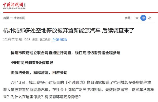 2021年7月,《錢(qián)江晚報(bào)·小時(shí)新聞》的《小時(shí)暗訪》欄目報(bào)道了杭州城郊多處空地停放大量新能源汽車一事。杭州市政府旋即部署了由市交通運(yùn)輸局(管理中心、執(zhí)法隊(duì))、市公安局(交通治安分局、交警支隊(duì))牽頭的聯(lián)合調(diào)查小組,摸排在城市郊區(qū)集中停放的新能源汽車情況。