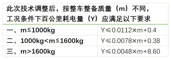 第三個指標(biāo)為“按整車整備質(zhì)量(m)不同,工況條件下百公里耗電量(Y)應(yīng)滿足要求”,此次技術(shù)調(diào)整將該指標(biāo)分為三種詳細(xì)情況: