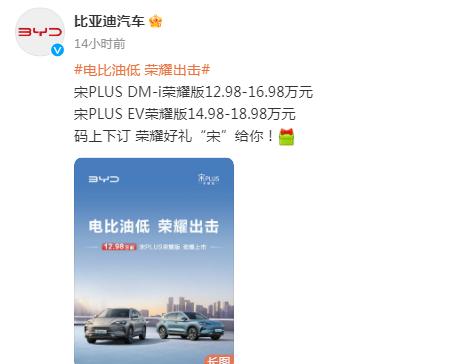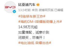 2月29日,比亞迪再出“王炸”。當(dāng)天,比亞迪汽車發(fā)布微博稱,宋PLUS DM-i榮耀版12.98萬(wàn)—16.98萬(wàn)元;宋PLUS EV榮耀版14.98萬(wàn)—18.98萬(wàn)元。同時(shí),比亞迪還推出B級(jí)轎車“新王炸”——海豹DM-i榮耀版勁爆上市,14.98萬(wàn)元起。