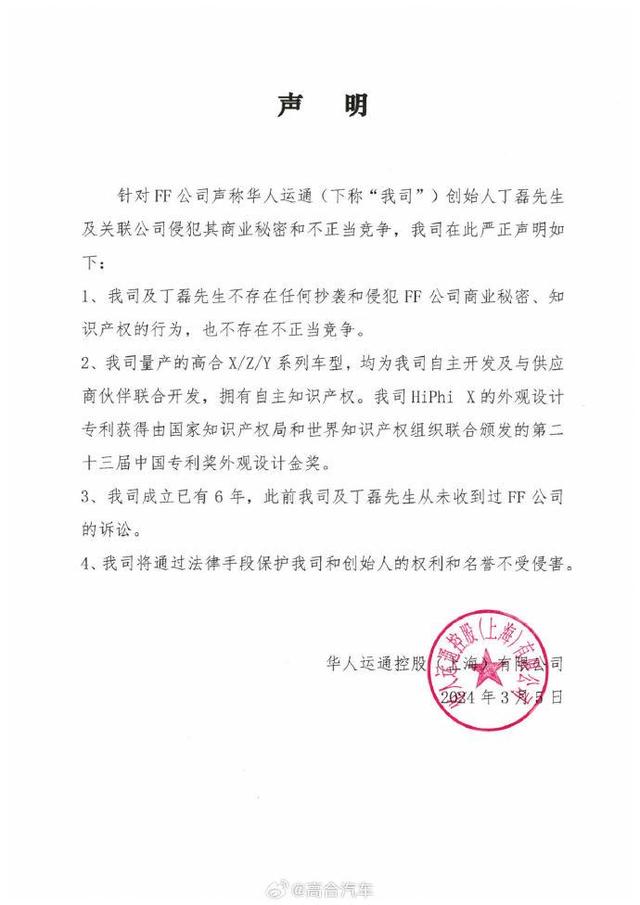 而在最新聲明中,高合汽車也指出,“我司成立已有6年,此前我司及丁磊先生從未收到過FF公司的訴訟。我司將通過法律手段保護我司和創(chuàng)始人的權(quán)利和名譽不受侵害。”