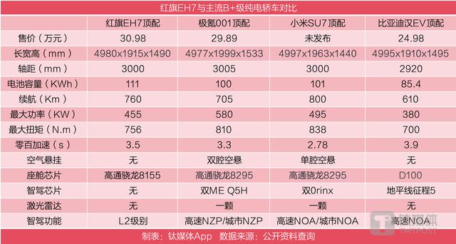 尺寸方面,紅旗EH7的車身尺寸和軸距,與極氪001和小米SU7相當(dāng),好于比亞迪漢EV。從近期體驗(yàn)過的評價來看,EH7的乘坐舒適度和二排空間受到好評。