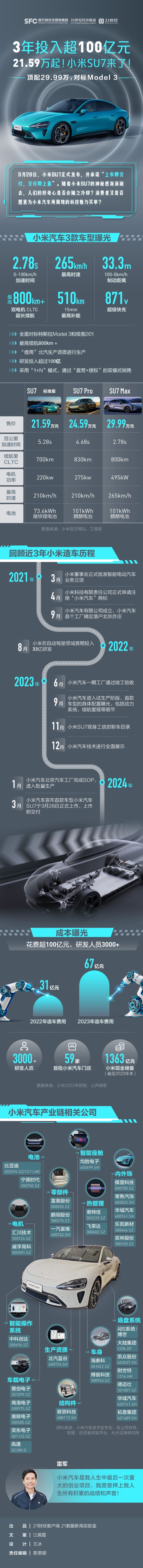 21數(shù)據(jù)新聞實驗室和你一圖回顧小米造車路:在過去三年里,小米在智能電動汽車領(lǐng)域的投入已經(jīng)突破百億元大關(guān),研發(fā)人員達到3400人。小米創(chuàng)辦人、董事長兼CEO雷軍認(rèn)為小米SU7是小米三年來的心血之作,這三年,小米汽車都經(jīng)歷了什么?定價在20多萬的區(qū)間,定位中高端的小米汽車如何獲得消費者認(rèn)可?