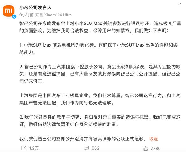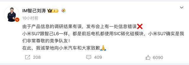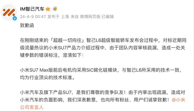約半小時(shí)后,智己汽車終于在官方微博作出回應(yīng)稱,在剛剛結(jié)束的智己L6超級(jí)智能轎車發(fā)布會(huì)過程中,對(duì)標(biāo)近期同級(jí)流量熱議的小米SU7產(chǎn)品力介紹過程中,由于團(tuán)隊(duì)內(nèi)容審核疏漏,造成一處關(guān)鍵參數(shù)的錯(cuò)誤標(biāo)注,澄清如下:小米SU7 Max版前后電機(jī)均采用SIC碳化硅模塊,與智己L6所采用的技術(shù)一致,均為行業(yè)頂尖的技術(shù)標(biāo)準(zhǔn),“小米汽車及旗下產(chǎn)品SU7,是我們尊敬的競(jìng)爭(zhēng)隊(duì)友!由于內(nèi)審出現(xiàn)疏漏,造成對(duì)小米汽車的負(fù)面影響,我們深表歉意,也向所有粉絲、用戶們誠(chéng)摯致歉!”