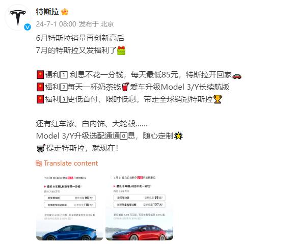 7月31日前,針對(duì)Model 3/Y標(biāo)準(zhǔn)續(xù)航版推出的1~5年0息和低息優(yōu)惠購(gòu)車政策,日供低至85元起;針對(duì)Model 3/Y長(zhǎng)續(xù)航全輪驅(qū)動(dòng)版推出的1~5年0息和低息購(gòu)車優(yōu)惠政策,日供低至107元起;特斯拉將7月限時(shí)低息的年費(fèi)率降至0.5%起(折合年化利率0.93%起)。