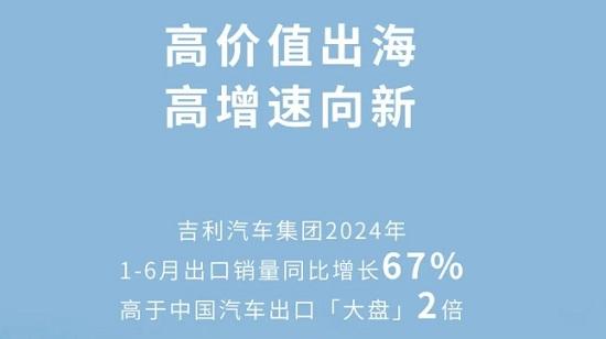 昨日,吉利汽車發(fā)布數(shù)據(jù)顯示,2024年上半年吉利汽車出口累計(jì)銷量達(dá)19.74萬(wàn)輛,同比增長(zhǎng)67%,高于中國(guó)汽車出口大盤兩倍,銷量、增速均創(chuàng)歷史新高。