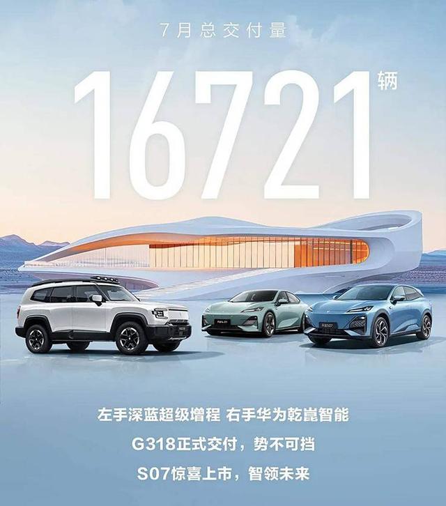 藍(lán)汽車官方宣布,7月累計(jì)共交付16721輛。在7月份,深藍(lán)G318正式開啟交付。深藍(lán)S07也迎來上市,該車共推出10款車型,售價(jià)區(qū)間為14.99-21.29萬(wàn)元。