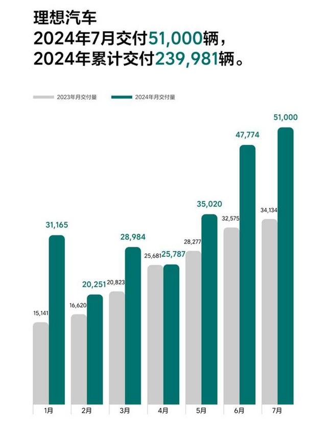 理想汽車在7月交付新車51000輛,創(chuàng)月交付量的歷史新高,同比增長(zhǎng)49.4%。今年1-7月,理想共計(jì)交付239981輛。截至2024年7月31日,理想汽車?yán)塾?jì)交付873345輛。