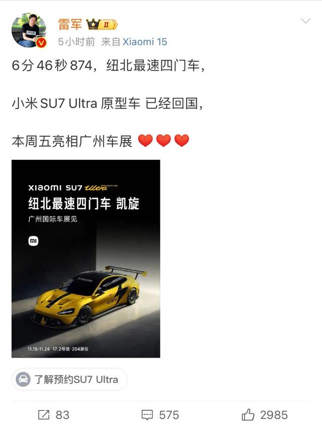 11月12日,雷軍在微博高調(diào)宣布:“小米SU7 Ultra原型車已經(jīng)回國(guó),并將于廣州車展上正式亮相。”據(jù)了解,該車定位為巔峰性能科技轎車,定價(jià)為81.49萬(wàn)元。然而,即便如此,在預(yù)訂開啟僅10分鐘內(nèi),小訂量就突破了3680臺(tái)。