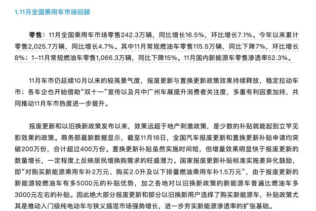 崔東樹分析,11月份汽車市場(chǎng)呈現(xiàn)產(chǎn)銷兩旺的態(tài)勢(shì),生產(chǎn)和零售數(shù)據(jù)都呈現(xiàn)出歷史較高水準(zhǔn)。從價(jià)格指標(biāo)來(lái)看,整體市場(chǎng)價(jià)格走勢(shì)平穩(wěn),汽車消費(fèi)需求強(qiáng)勁、態(tài)勢(shì)良好,新能源車的銷售表現(xiàn)亮眼。