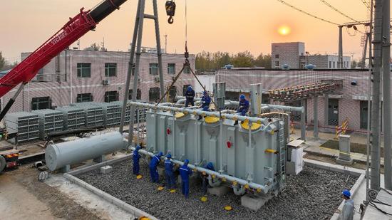 國網(wǎng)石家莊供電公司工作人員對220千伏安托變電站主變進(jìn)行更換作業(yè)。胡國秋攝