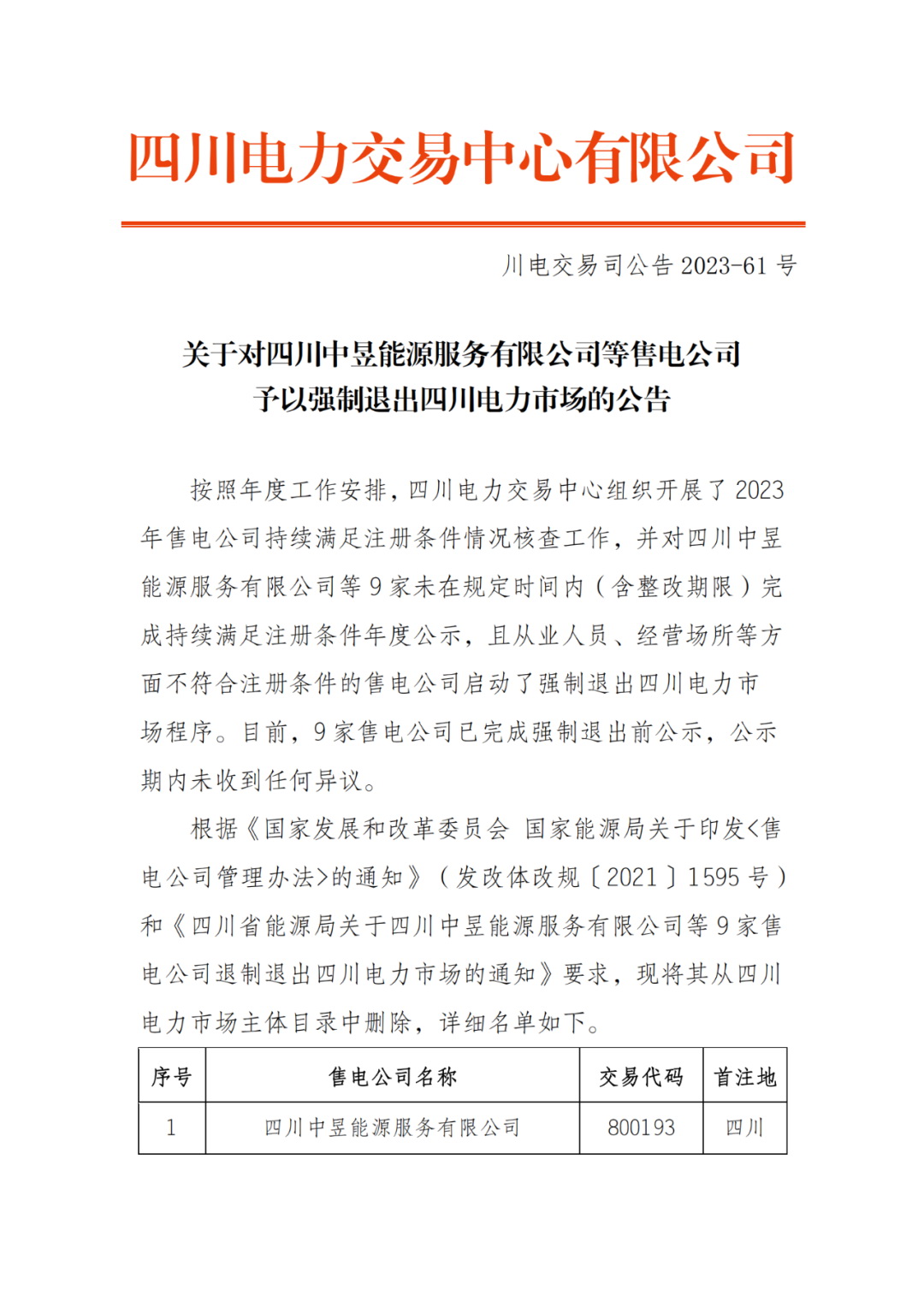 8月7日,四川電力交易中心發(fā)布《關(guān)于對四川中昱能源服務(wù)有限公司等售電公司予以強制退出四川電力市場的公告》。詳情如下:
