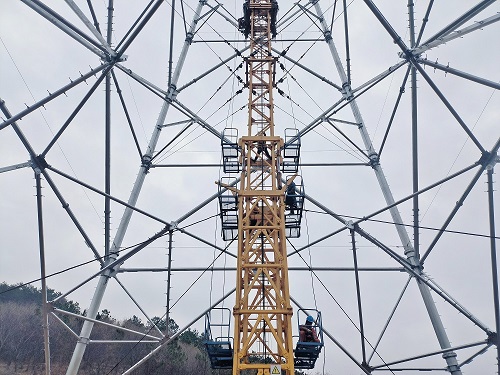 中國(guó)電力網(wǎng)訊 12月7日,在湖北紅安縣杏花鄉(xiāng),湖北送變電公司駐馬店一武漢1000千伏特高壓線路工程(6)標(biāo)(3S219號(hào))組塔施工現(xiàn)場(chǎng), 項(xiàng)目工人正在進(jìn)行抱桿拆卸施工作業(yè)。(劉偉康、郭暉)