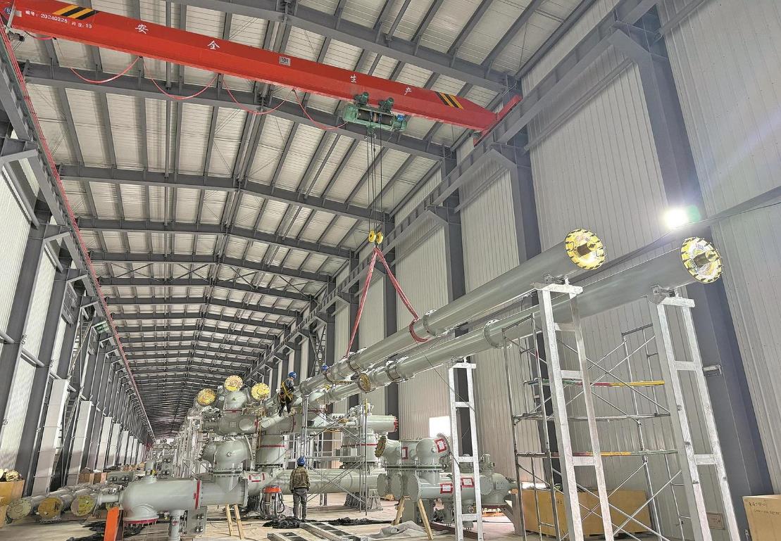 8月26日,施工人員在丁字口變電站330千伏戶內(nèi)氣體絕緣全封閉組合電器廠房內(nèi)對接母線筒。 劉博博 攝
