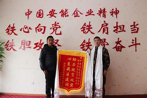 3月底,薩嘎縣達(dá)吉嶺鄉(xiāng)派出所營(yíng)區(qū)計(jì)劃進(jìn)行整體硬化,但由于當(dāng)?shù)亟ㄔO(shè)經(jīng)費(fèi)緊張,一直未能批復(fù)。何樂(lè)鋒在了解當(dāng)?shù)氐睦щy后,主動(dòng)為他們捐贈(zèng)了20噸水泥,解決了他們建設(shè)的燃眉之急,有效改善了派出所的辦公生活條件。嶺鄉(xiāng)派出所所長(zhǎng)旦增扎巴專程來(lái)到項(xiàng)目部,為全體人員獻(xiàn)上潔白的哈達(dá),為項(xiàng)目部贈(zèng)送了印有“心系藏區(qū)建設(shè),助力脫貧攻堅(jiān)”內(nèi)容的錦旗和感謝信,“中國(guó)安能為我們幫了大忙,建設(shè)阿里聯(lián)網(wǎng)工程為我們送電,為我們解決務(wù)工難題,還支持我們建設(shè),我受我們鄉(xiāng)書(shū)記委托,專程過(guò)來(lái)感謝你們,我們達(dá)吉嶺鄉(xiāng)全鄉(xiāng)人民都感謝你們!”他緊握項(xiàng)目經(jīng)理何樂(lè)峰的雙手,動(dòng)情地說(shuō)道。