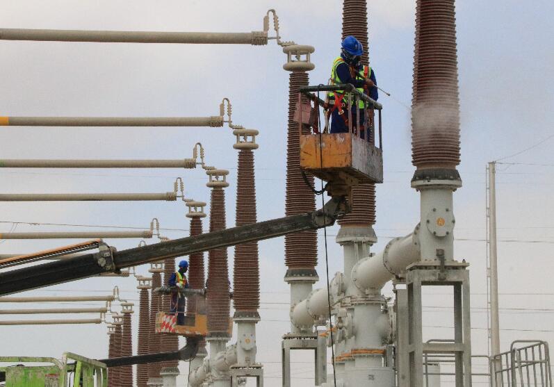 “電力天路”青藏聯(lián)網(wǎng)工程年檢期間,國家電網(wǎng)有限公司專業(yè)人員在±400千伏柴達木換流站對交流濾波器場進線套管進行水沖洗。