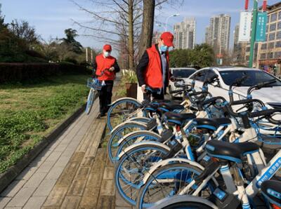圖為“紅馬甲”整理擺放共享單車