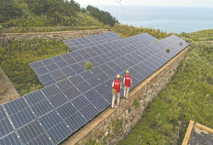 國家電網(wǎng)江蘇電力(連云港)共產黨員服務隊隊員在位于贛榆區(qū)厲莊鎮(zhèn)的二龍山光伏發(fā)電站,幫助客戶檢查光伏發(fā)電設備。