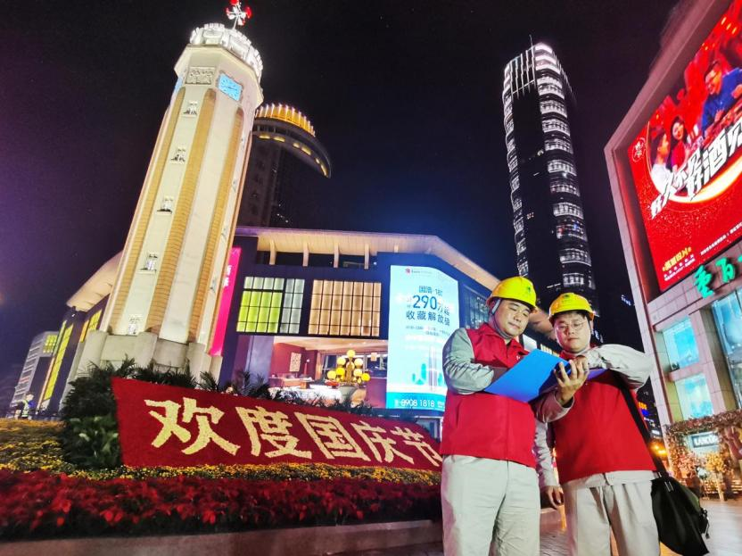 國網(wǎng)重慶市區(qū)供電公司員工在解放碑商圈巡查線路設(shè)備。