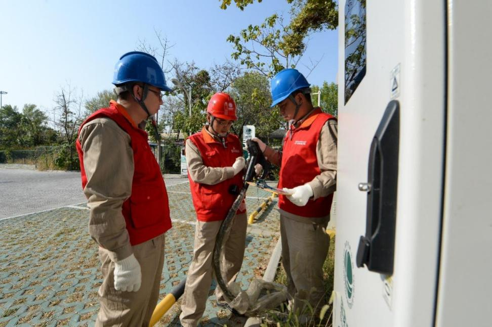 國家電網(wǎng)共產(chǎn)黨員服務(wù)隊檢查天津市第二工人文化宮充電站設(shè)備。