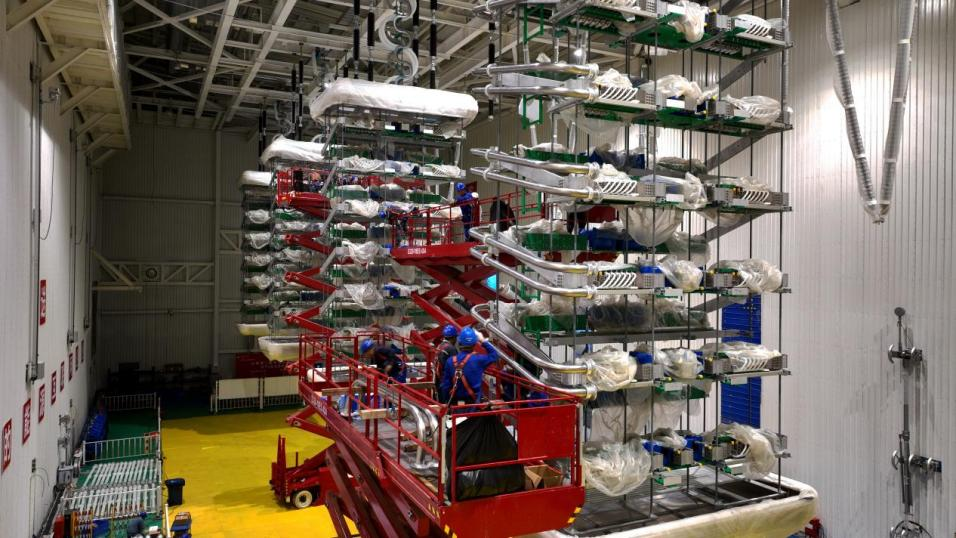 國網(wǎng)四川送變電公司員工在±800千伏布拖換(建昌)換流站建設(shè)現(xiàn)場開展閥塔設(shè)備安裝作業(yè)。