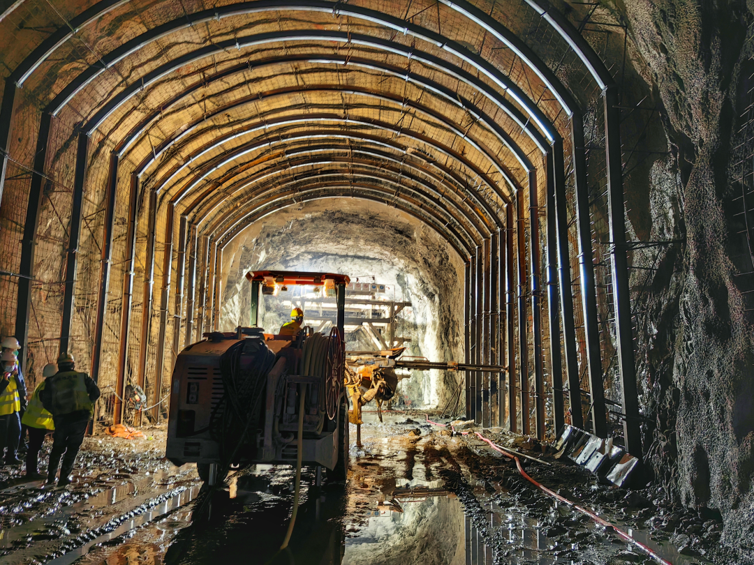 南方電網加快推進梅蓄二期、肇慶浪江、惠州中洞抽水蓄能電站建設。圖為在肇慶浪江抽水蓄能電站交通洞礃子面附近處,工作人員進行錨桿鉆孔施工。李志杰 攝