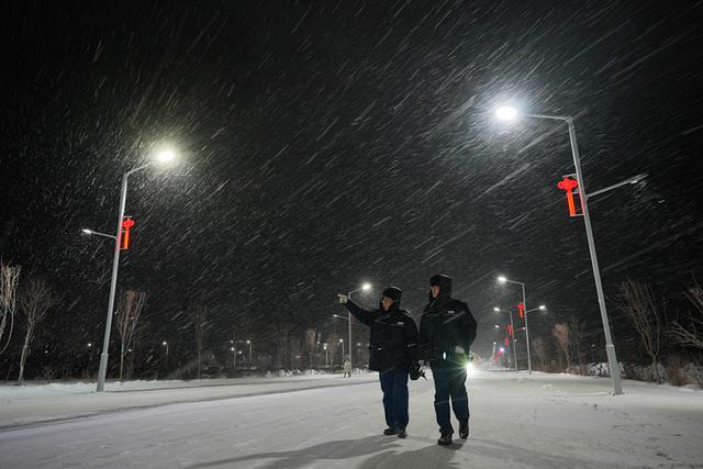 國網(wǎng)蒙東電力員工對保暖涉及配電線路進行夜巡。