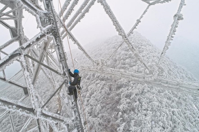 國網湖北電力員工清除±800千伏陜武特高壓直流輸電線路地線覆冰。