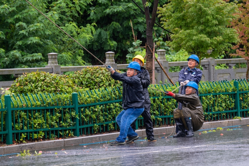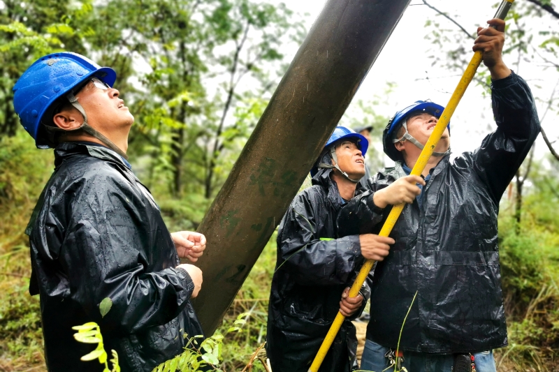 國網(wǎng)安徽蕪湖供電公司員工冒雨搶修因雷擊發(fā)生故障的10千伏渡江線。