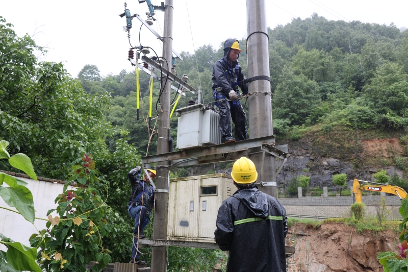 國網(wǎng)陜西商洛柞水縣供電公司員工冒雨搶修營湖小區(qū)臺區(qū)。