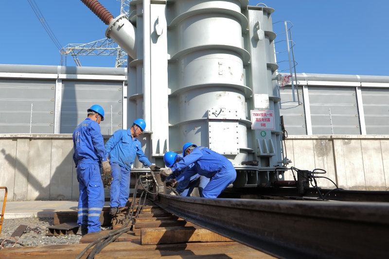 國網(wǎng)新疆超高壓分公司員工在750千伏亞中變電站開展高抗整體平移更換。
