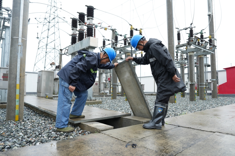 國網(wǎng)河南信陽供電公司員工在35千伏臨河變電站開展防汛特巡。