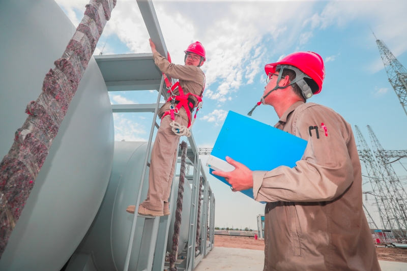 國網(wǎng)天津送變電公司員工在天津南1000千伏變電站檢查主變油罐壓力。