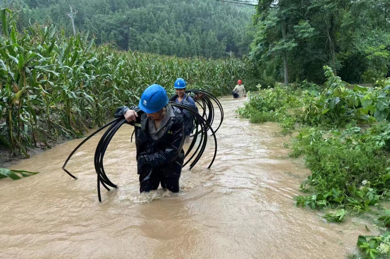 國網(wǎng)重慶開州供電公司員工蹚水前往巫山鎮(zhèn)處理10千伏鐵上線故障。