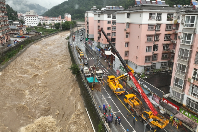 國網(wǎng)陜西寶雞供電公司員工為受汛情影響小區(qū)接通發(fā)電車。