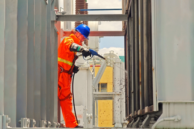 國網(wǎng)山西陽泉供電公司員工帶電水沖洗220千伏溫池變電站1號主變散熱器。