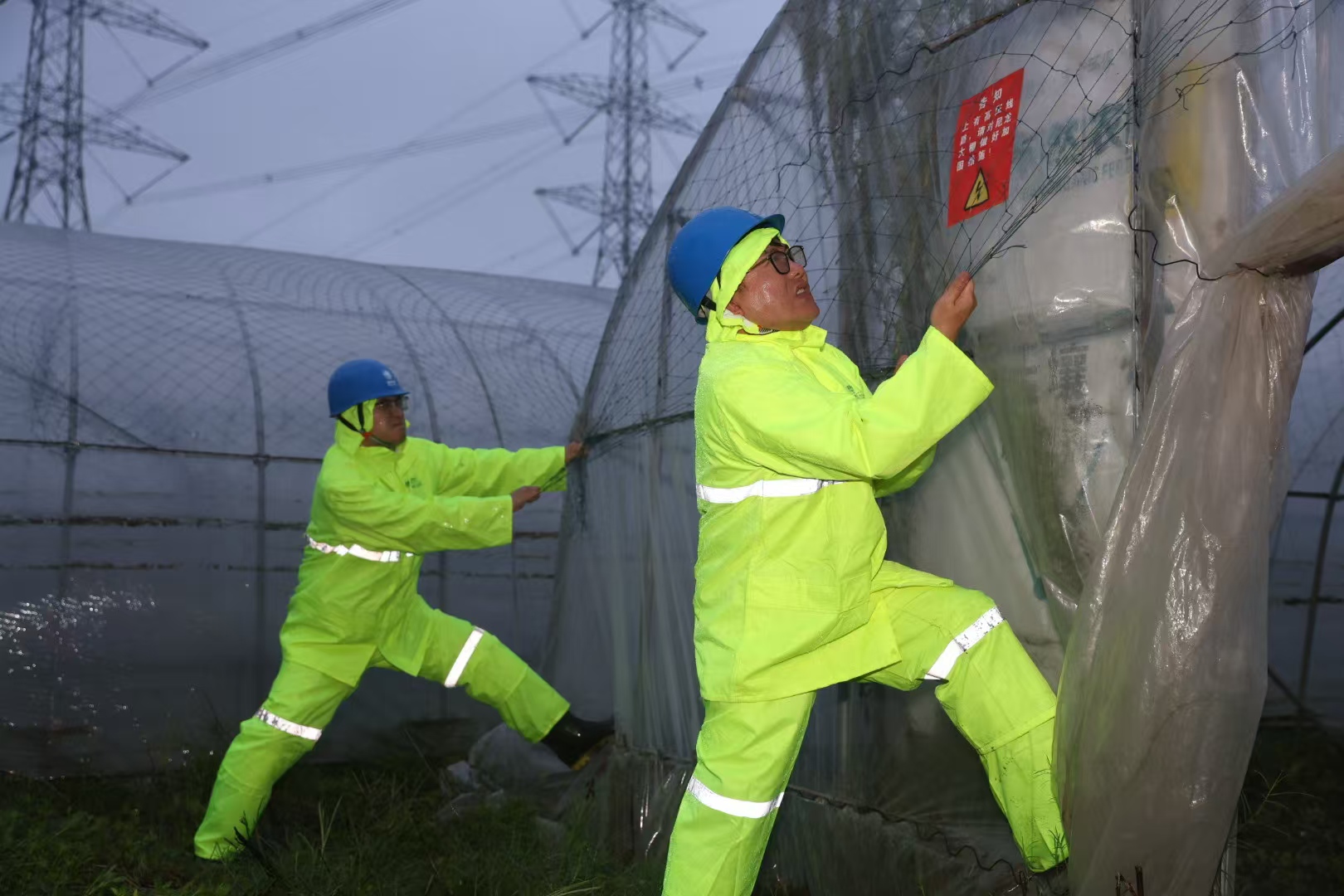 國網(wǎng)上海超高壓公司輸電運維人員在浦東臨港地區(qū)緊急處置輸電通道下破損蔬菜大棚